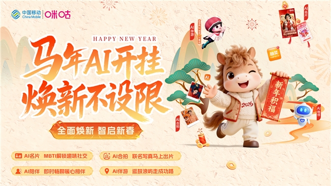 此外,中国移动咪咕"马年AI开挂焕新不设限"活动聚合页推出五大创新玩法:用户可抽取新年运势签、设置祝福视频或贺卡,为拜年添彩,并支持生成专属MBTI年味人格标签,丰富新年社交玩法;还能上传照片5s解锁新年大片,轻松刷爆朋友圈;更可在鼓浪屿元宇宙中体验数智出行的乐趣,让春节不再局限于宅家躺平;同时可以收获24小时陪伴的数智伙伴,让留守的春节不再孤单。基于真实场景,创新推出的《诶?哎!》等创意短片,则以魔性内容演绎拜年痛点,助力用户过个年味浓郁的新时代数智年。中国移动咪咕依托中台能力,为用户构建起可感知、可参与、可分享的新春场景,实现春节模式的一键切换!