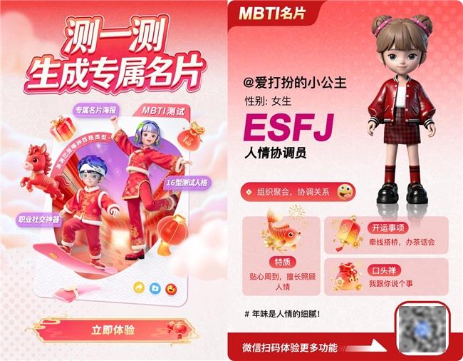 第一步,从一张年味名片开始。过年讨个好彩头,打开中移AI名片,摇签抽取事业、财富、健康、爱情等运势签;新年社交怕尴尬冷场?打开新春特别版MBTI测试,即可解锁“宴席策划家ENFJ”、“守岁逻辑家ISTJ”等专属人格标签。接着,制作真人数智人拜年视频或马元素贺卡转发好友,让祝福与众不同。同时,在咪咕咖啡首钢园线下打卡点还升级了“品尝咖啡+完成趣味测评+解锁新春运势签+社交分享”的一站式新春体验。
