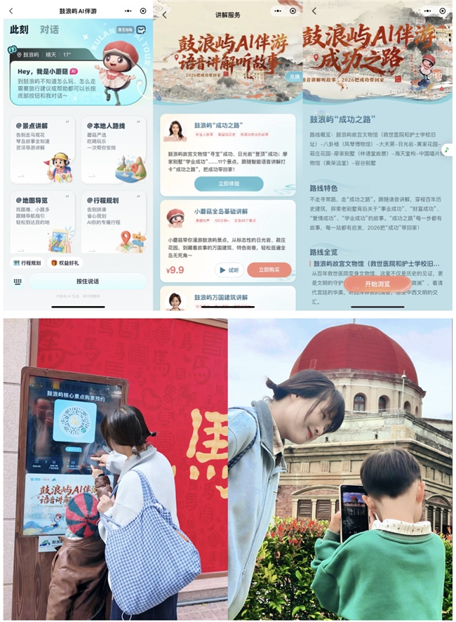 新春不仅要个人形象焕新,出游也要有新方式。“鼓浪屿AI伴游”面向游客、亲子等群体,以“马上成功”为主题,全新上线定制化文旅讲解内容及服务。一部手机,在鼓浪屿元宇宙小程序就能一站式搞定游前做攻略、游中听讲解、游后购文创的全流程数智文旅服务。在漫步琴岛的过程中,游客可跟随AI伴游聆听建筑背后的“成功”故事,在一步一景间感受鼓浪屿百年底蕴;行程结束后,游客通过AI+3D文创定制的玩法,将此次旅途“成功”的美好寓意带回家,让旅途记忆以更鲜活、立体的方式被珍藏。