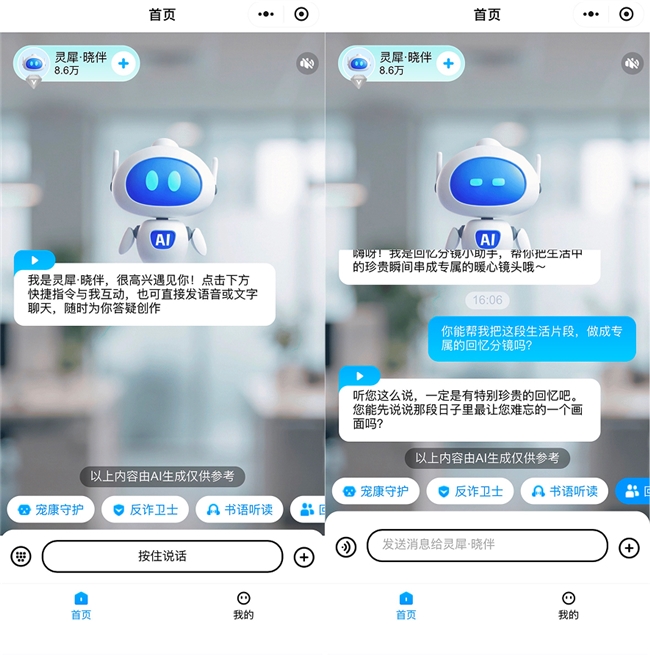 而贯穿整个新春旅程,无论社交、合拍、还是出游,都有一个始终在线的温暖陪伴。 中国移动咪咕的情感智能AI伙伴“晓伴”,是大家随时可倾诉的心灵疗愈伙伴,是可以随时倾诉的情绪树洞,是能与你妙语连珠畅聊古今的聊天搭子,更是贴心可靠的全能生活助手。从规划拜年路线,到查询年俗趣事;从回应疑问,到主动关心情绪,“晓伴”做到一站式解决生活与工作的便捷需求,让科技温度,渗透到春节每一个细微瞬间。